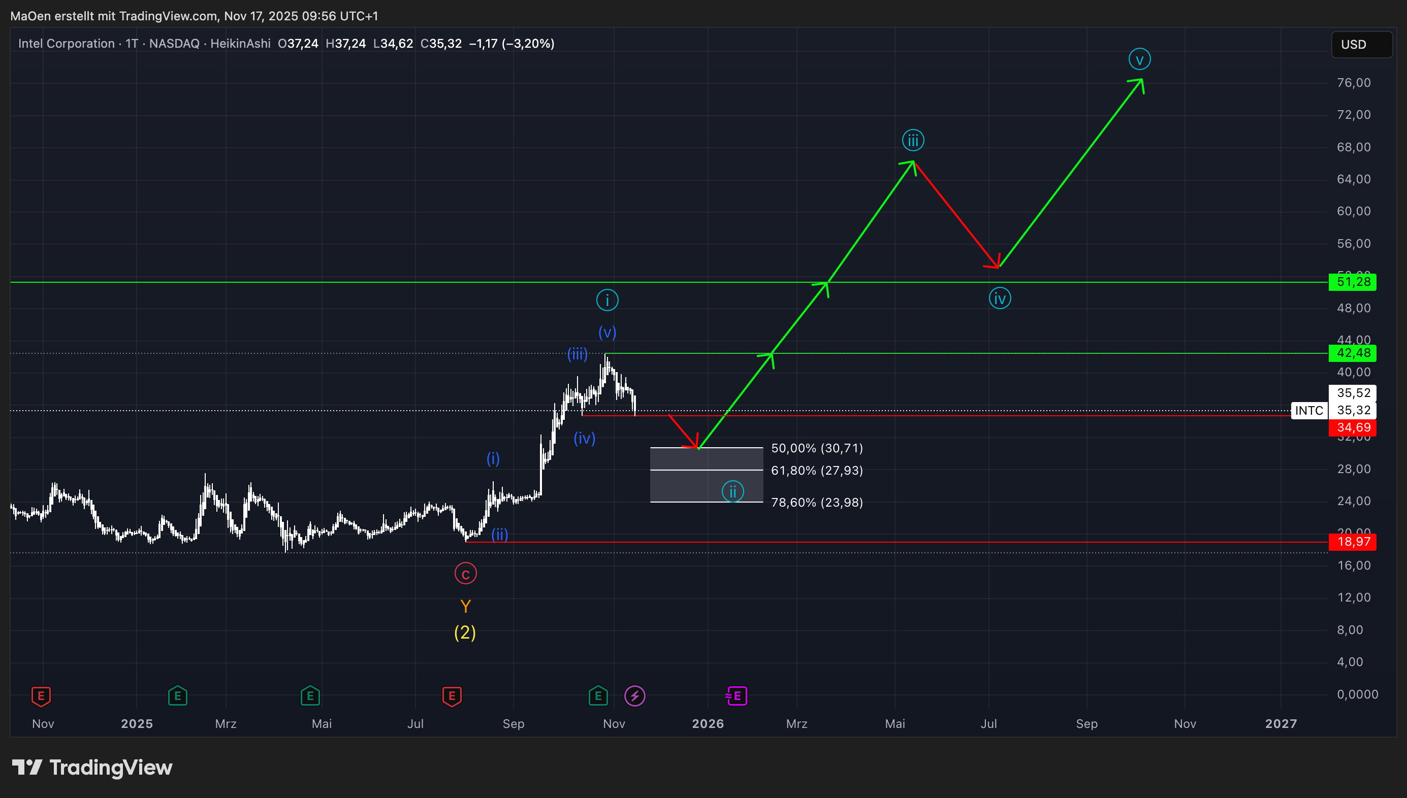 The Fibonacci retracement zone offers a compelling accumulation window for long-term positioning. Should Intel break below its local support at $34.69 (highlighted in red), we see a high probability that price will continue into the retracement zone, where a structural low for wave 2 and a momentum shift is expected to form.