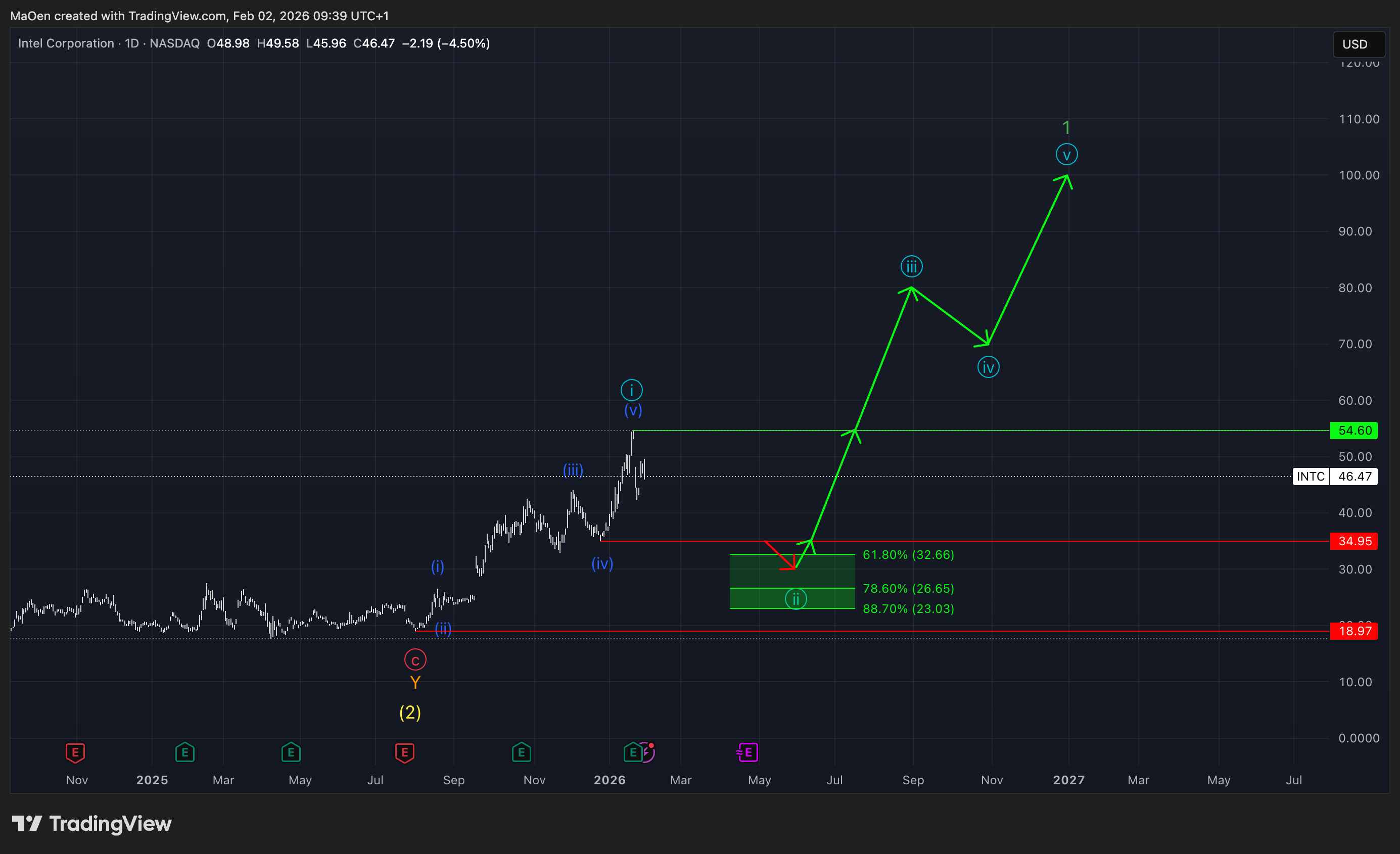 This corrective structure persisted for approximately 25 years, until Intel began to regain bullish momentum toward the end of 2025 and the beginning of 2026. With the completion of this long-term yellow wave 2, Intel has established a structural low, laying the foundation for a new secular bullish market.