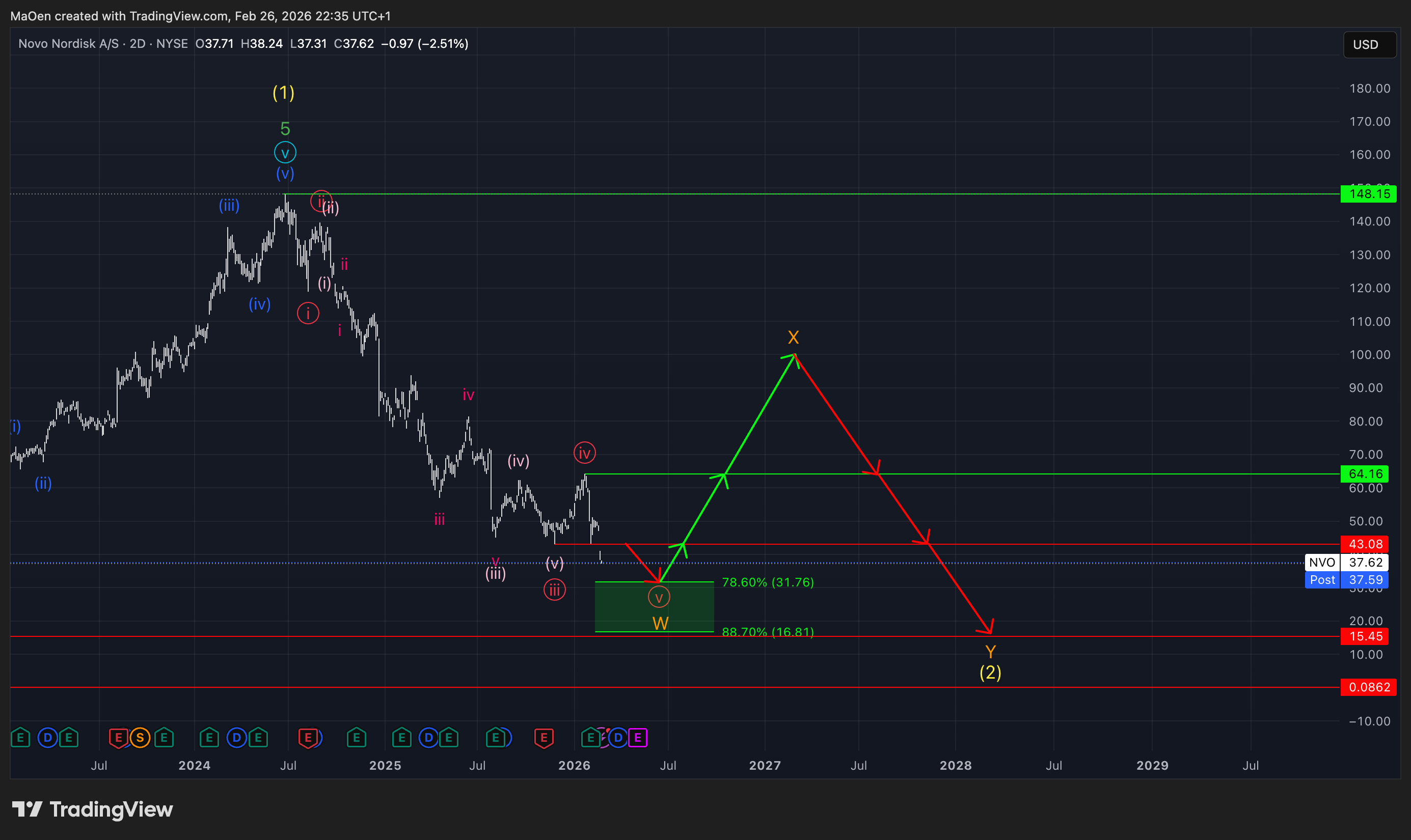 By developing green waves 3 and 4, the long-term bull run entered its final impulsive upward movement, forming bullish green wave 5. Once green wave 5 was completed in 2024, Novo Nordisk formed yellow wave 1 and marked a major top at its all-time high of $148.15.